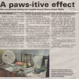 Positive apparel is a family run thrift store. We have been in business since Jan 2009 and started off as a little store just off Historic Baker St. We started originally because of an article written in the Nelson Daily News about the amount of clothing going into the landfill. We wanted to help and started our little shop beside El taco on Victoria St in 2009. At the time we chose to raise money for the Second Chance Animal Shelter and so Paws-itive Apparel Thrift store was born.